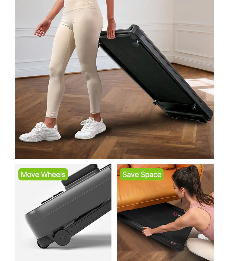 Grazie alle ruote integrate puoi spostare il walking pad senza sforzo e riporlo comodamente sotto il divano o la scrivania, mantenendo la casa ordinata e libera da ingombri.